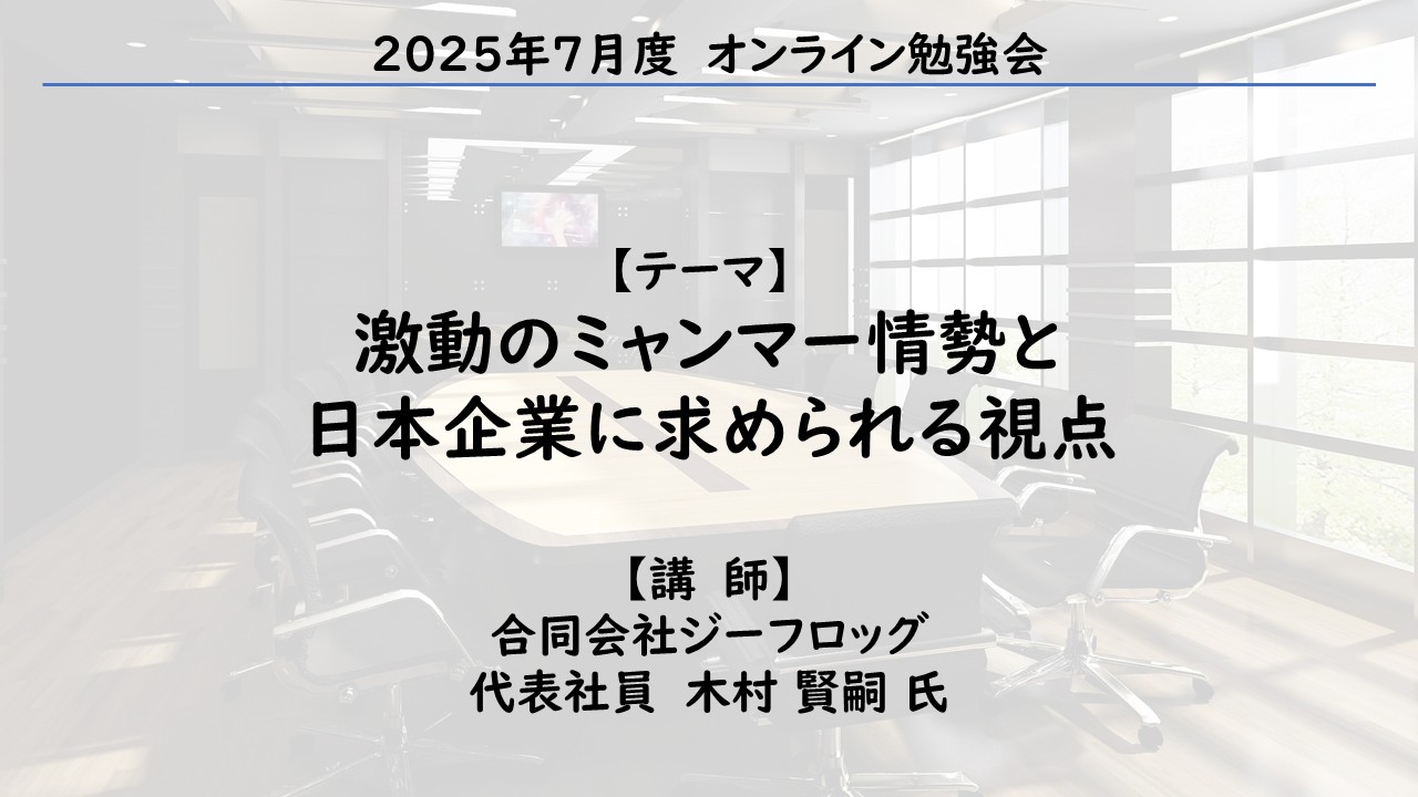 今回は「激動のミャンマー情勢と日本企業に求められる視点」をテーマに、合同会社ジーフロッグ 代表社員 木村 賢嗣 氏を講師としてお迎えしました。